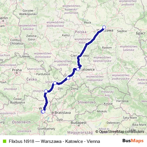 The first stop of the Flixbus N918 bus route is Vienna Central Station and the last stop is Warsaw, Bus Station West. Flixbus N918 (Warszawa - Katowice - Vienna) is operational during täglich.