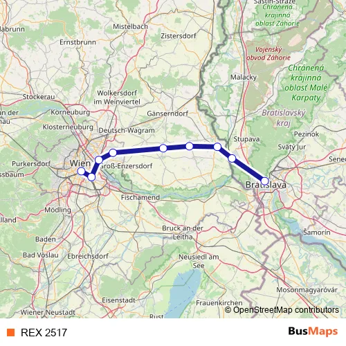 The first stop of the REX 2517 rail route is Bratislava hl.st. and the last stop is Wien Hbf. REX 2517 is operational during täglich.