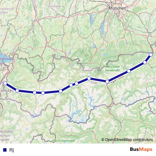 The first stop of the Rj rail route is Kufstein and the last stop is