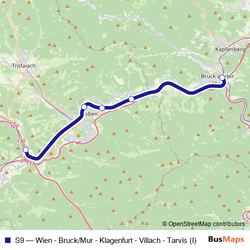 The first stop of the S9 rail route is Bruck/Mur Bahnhof 1 and the last stop is St.Michael Bahnhof. S9 (Wien - Bruck/Mur - Klagenfurt - Villach - Tarvis (I)) is operational during täglich.