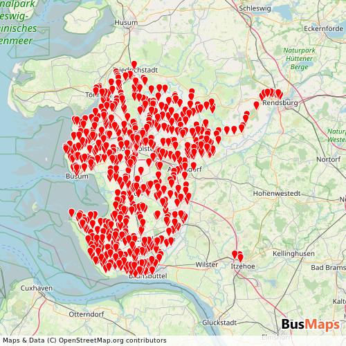 DB Regio Bus Nord Gmbh operates in the following cities: Heide, Brunsbuettel, Neufelderkoog, Albersdorf, Busenwurth, Hennstedt, Kronprinzenkoog, Meldorf, Neuenkirchen, Osterrade, Bargenstedt, Buesumer Deichhausen, Burg, Eddelak, Elpersbuttel, Fedderingen, Friedrichskoog, Hedwigenkoog, Helse, Hochdonn, Linden, Pahlen, Ramhusen, Rehm-Flehde-Bargen, Rendsburg, Sankt Annen, Schlichting, Tielen, Wesselburener Deichhausen, Wesselburenerkoog.