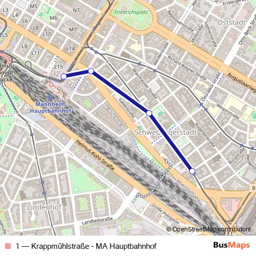 The first stop of the 1 bus route is Krappmühlstraße and the last stop is MA Hauptbahnhof. 1 (Krappmühlstraße - MA Hauptbahnhof) is operational during täglich.