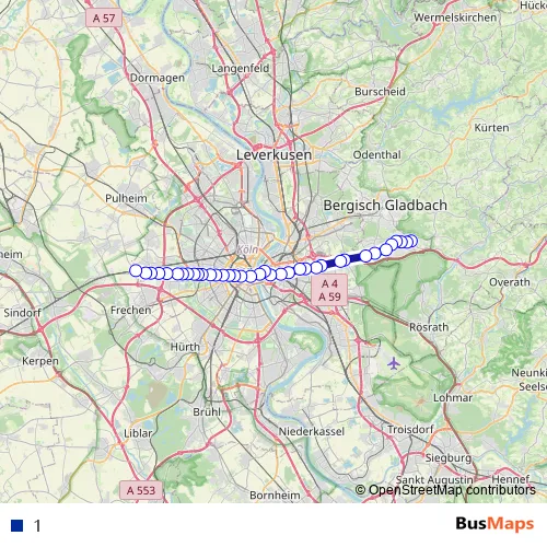 The first stop of the 1 metro route is Bergisch Gladbach Bensberg and the last stop is Köln Weiden West. 1 is operational during täglich.