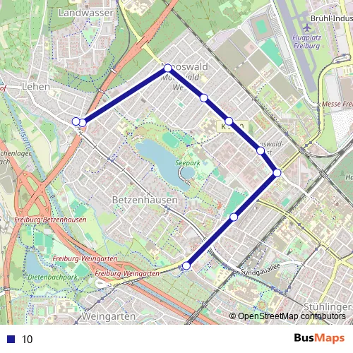 The first stop of the 10 bus route is Freiburg, Bissierstraße and the last stop is Freiburg, Paduaallee. 10 is operational during täglich.