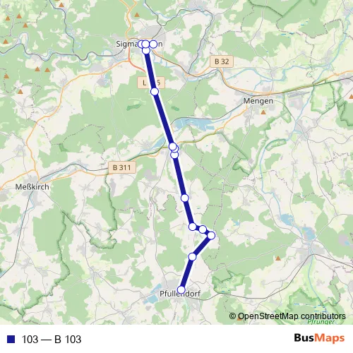 The first stop of the 103 bus route is Pfullendorf, Amtsgericht and the last stop is Sigmaringen, Liebfrauenschule. 103 (B 103) is operational during an Werktagen.