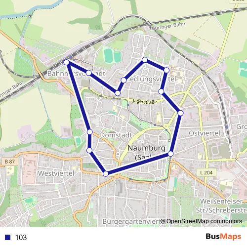 The first stop of the 103 bus route is Naumburg (Saale), City-Busstop Hallesche Str. and the last stop is Naumburg (Saale), City-Busstop Hallesche Str.. 103 is operational during täglich.