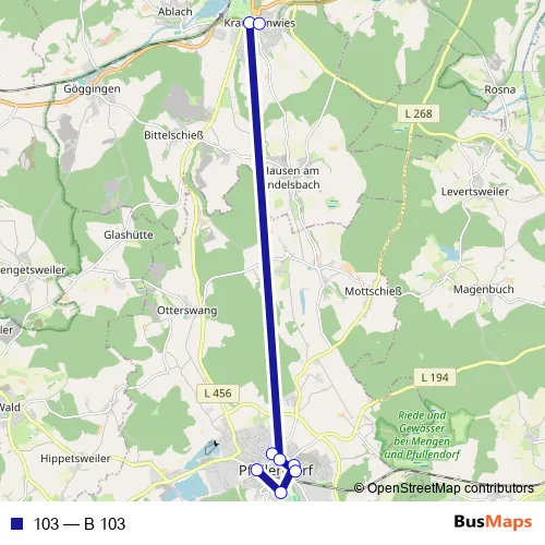The first stop of the 103 bus route is Pfullendorf, Zob and the last stop is Krauchenwies, Rathaus. 103 (B 103) is operational during an Werktagen.