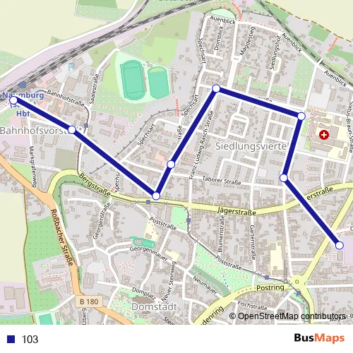 The first stop of the 103 bus route is Naumburg (Saale), City-Busstop Hallesche Str. and the last stop is Naumburg (Saale), Busbahnhof am Hauptbahnhof. 103 is operational during täglich.