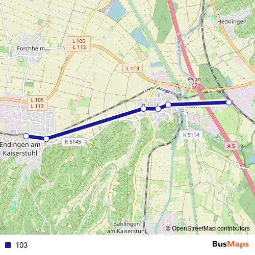 The first stop of the 103 bus route is Riegel-Malterdingen and the last stop is Endingen a K Bahnhof. 103 is operational during täglich.