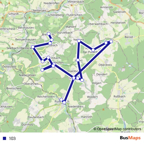 The first stop of the 103 bus route is Puderbach Verbandsgemeinde and the last stop is Niederwambach Breibach Altenkirchener Straße. 103 is operational during an Werktagen.