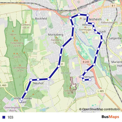 The first stop of the 103 bus route is Hildesheim Hildesheimer Wald and the last stop is Hildesheim Am Burghof. 103 is operational during täglich.