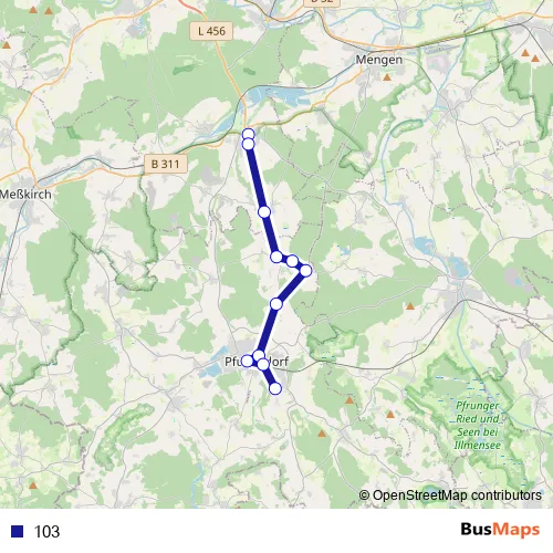 The first stop of the 103 bus route is Krauchenwies, Rathaus and the last stop is Pfullendorf, Vogelsang. 103 is operational during an Werktagen.
