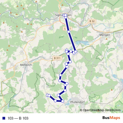 The first stop of the 103 bus route is Wald (Hohenz), Busbahnhof and the last stop is Sigmaringen, Bahnhof. 103 (B 103) is operational during an Werktagen.