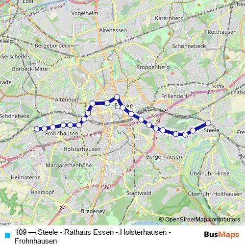 The first stop of the 109 tram route is Frohnhausen Breilsort and the last stop is Essen Steele S. 109 (Steele - Rathaus Essen - Holsterhausen - Frohnhausen) is operational during täglich.