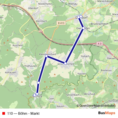 The first stop of the 110 bus route is Dierdorf Markt and the last stop is Isenburg Böhm. 110 (Böhm - Markt) is operational during täglich.