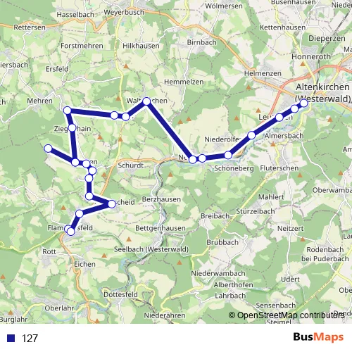 The first stop of the 127 bus route is Flammersfeld Rathaus and the last stop is Walterschen Lindenstraße. 127 is operational during an Werktagen.