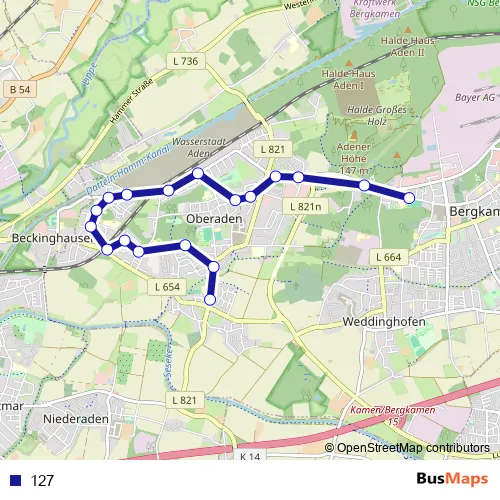 The first stop of the 127 bus route is Bergkamen, Gymnasium and the last stop is Oberaden, Jahnstr.. 127 is operational during an Werktagen.