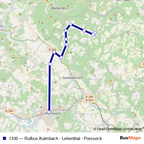 The first stop of the 1330 bus route is Presseck Aussichtsturm - Pressecker Knock and the last stop is Kulmbach Zob. 1330 (Rufbus Kulmbach - Lehenthal - Presseck) is operational during an Werktagen.
