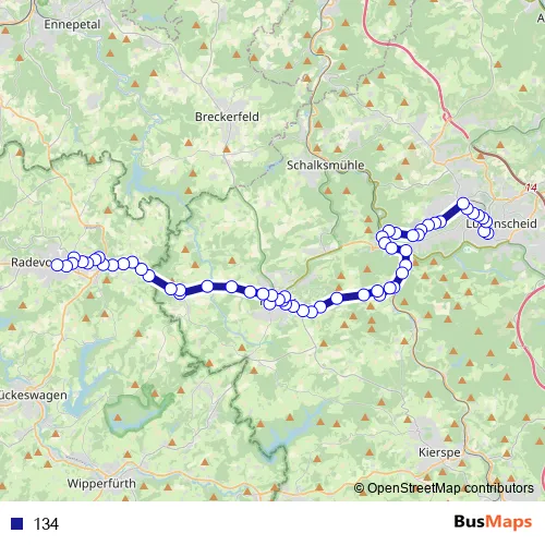 The first stop of the 134 bus route is Lüd., Kulturhaus and the last stop is Radevormwald Busbf. 134 is operational during täglich.