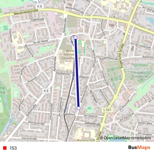 The first stop of the 153 bus route is Bi-Schildesche, Sieboldstraße and the last stop is Bielefeld, Schildesche. 153 is operational during an Werktagen.