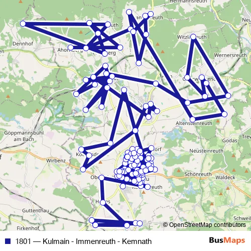 The first stop of the 1801 bus route is Ahornberg (Kr Tir) and the last stop is Kemnath-Neustadt Bahnhof. 1801 (Kulmain - Immenreuth - Kemnath) is operational during täglich.