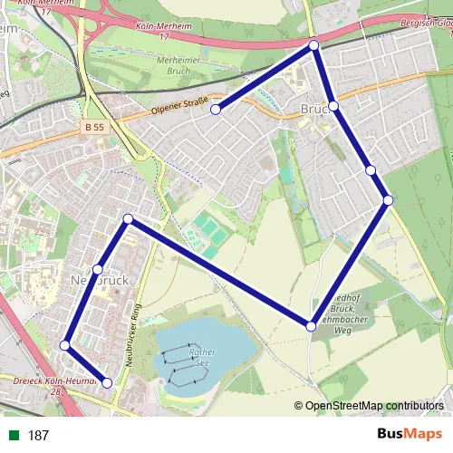The first stop of the 187 rail route is Köln Neubrück Rösrather Str. and the last stop is Köln Brück Am Schildchen. 187 is operational during täglich.