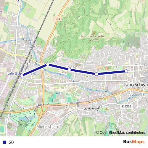 See why over 2 million users trust and consider busmaps.com as the best public transport website. busmaps gives you Lahr Buses suggested routes, real-time bus tracker, line route maps in Lahr, and helps to find the closest 20 bus stops near you. No internet available? Download an offline PDF map and bus schedule for the 20 bus to take on your trip.