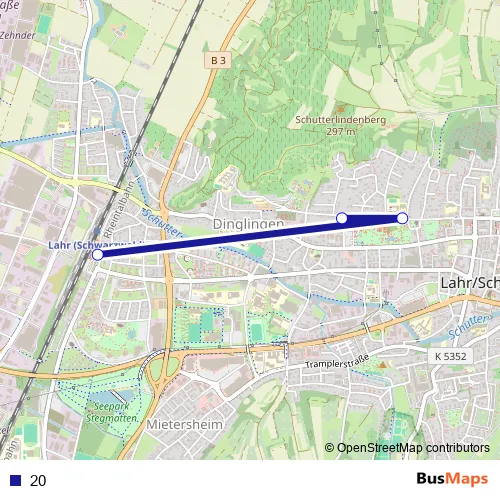 See why over 2 million users trust and consider busmaps.com as the best public transport website. busmaps gives you Lahr Buses suggested routes, real-time bus tracker, line route maps in Lahr, and helps to find the closest 20 bus stops near you. No internet available? Download an offline PDF map and bus schedule for the 20 bus to take on your trip.