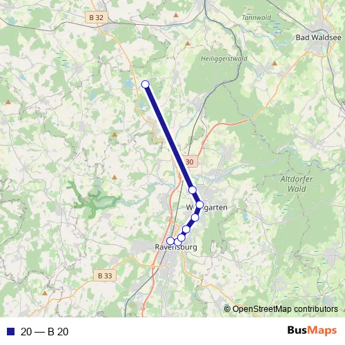 The first stop of the 20 bus route is Ravensburg, Bahnhof and the last stop is Wolpertswende, Vorsee Ort. 20 (B 20) is operational during an Werktagen.