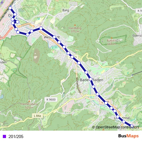The first stop of the 201/205 bus route is Baden-Baden Bahnhof and the last stop is Lichtental. 201/205 is operational during täglich.