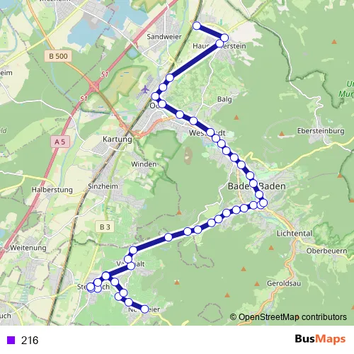 The first stop of the 216 bus route is Neuweier Kirche and the last stop is Haueneberstein Industriegebiet. 216 is operational during täglich.