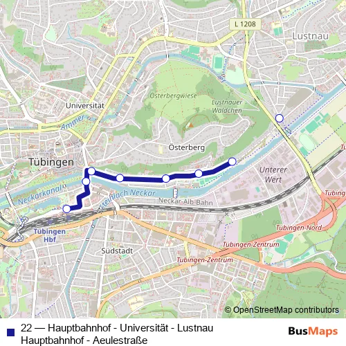 The first stop of the 22 bus route is Tübingen Carlo-Steeb-Str. and the last stop is Tübingen Hauptbahnhof Bstg J. 22 (Hauptbahnhof - Universität - Lustnau Hauptbahnhof - Aeulestraße) is operational during täglich.