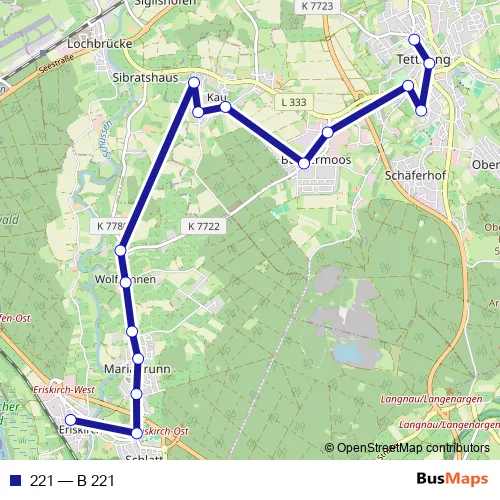 The first stop of the 221 bus route is Tettnang, Kirche and the last stop is Eriskirch, Irisstrasse. 221 (B 221) is operational during täglich.