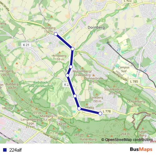 The first stop of the 224alf bus route is Bi-Hob/Uerent., Mönkebergstr and the last stop is Bielefeld, Dornberg Bürgerzentrum. 224alf is operational during täglich.