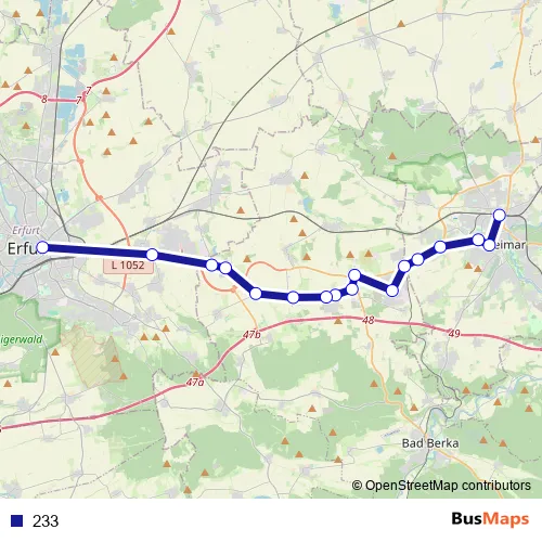 The first stop of the 233 bus route is Weimar, Hauptbahnhof and the last stop is Erfurt, Krämpfertor (P). 233 is operational during täglich.