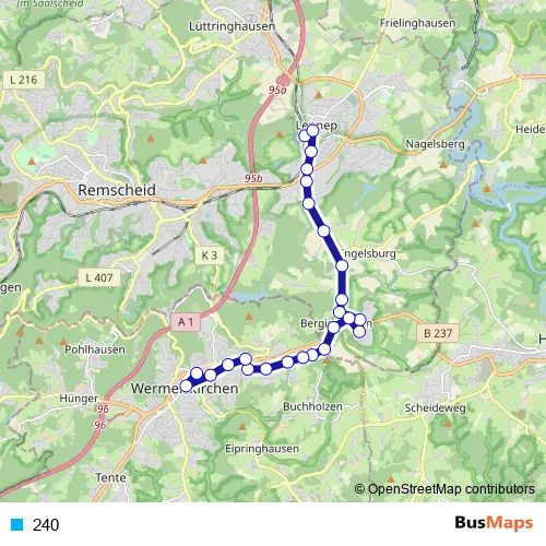 The first stop of the 240 tram route is Remscheid Lennep Bf Bstg C and the last stop is Wermelskirchen Busbf. 240 is operational during täglich.