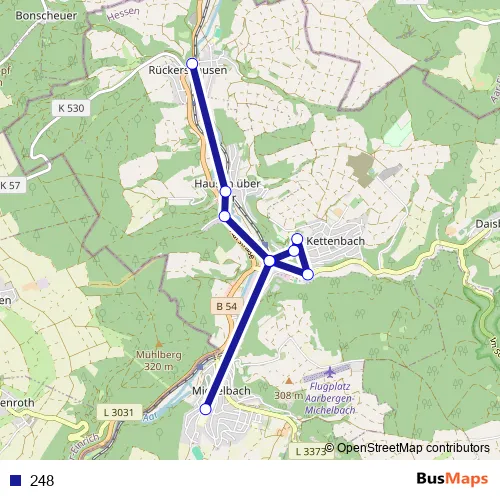 The first stop of the 248 bus route is Aarbergen-Michelbach Gesamtschule and the last stop is Aarbergen-Rückershausen Im Aargrund. 248 is operational during an Werktagen.