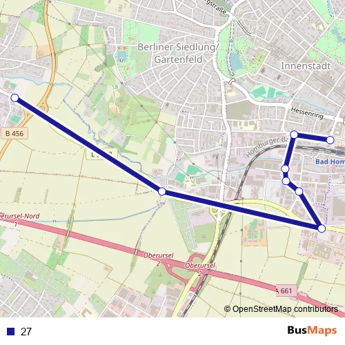 See why over 2 million users trust and consider busmaps.com as the best public transport website. busmaps gives you Bad Homburg vor der Hoehe Buses suggested routes, real-time bus tracker, line route maps in Bad Homburg vor der Hoehe, and helps to find the closest 27 bus stops near you. No internet available? Download an offline PDF map and bus schedule for the 27 bus to take on your trip.