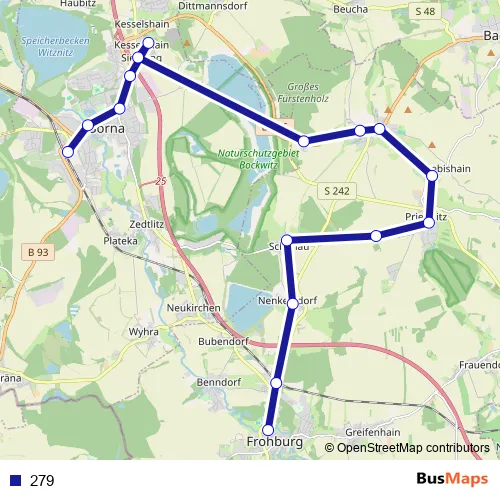 The first stop of the 279 bus route is Borna (b. Leipzig), Bahnhof (Bus) and the last stop is Frohburg, Zentralhaltestelle. 279 is operational during an Werktagen.
