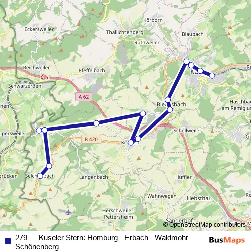 Bus 279 - Kuseler Stern: Homburg - Erbach - Waldmohr - Schönenberg Schedule in Homburg