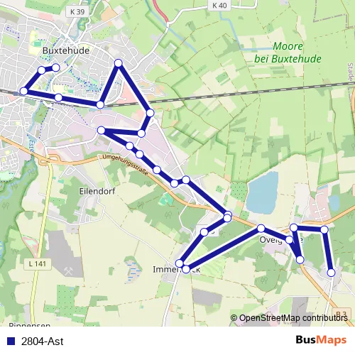 The first stop of the 2804-Ast bus route is Buxtehude, Zob and the last stop is Ketzendorf, Ketzendorfer Grund. 2804-Ast is operational during täglich.