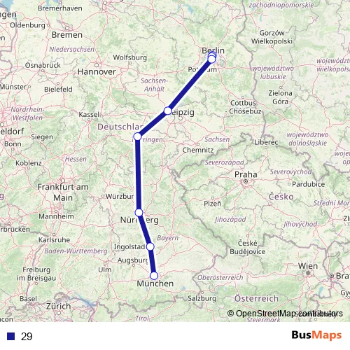 The first stop of the 29 rail route is S+U Gesundbrunnen Bhf (Berlin) and the last stop is München Hbf. 29 is operational during täglich.