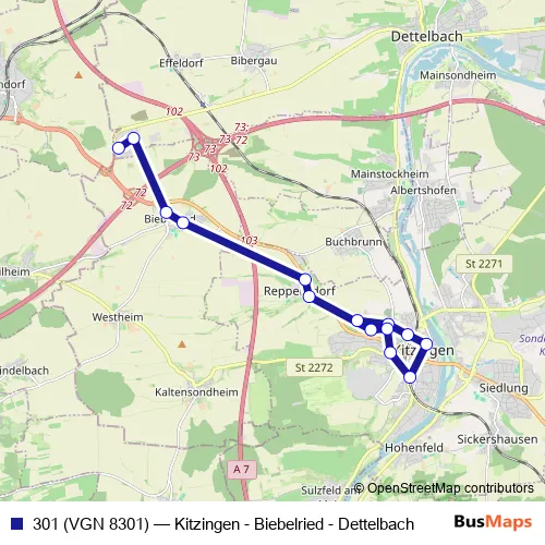 Click here to view the nearest 301 (VGN 8301) - Kitzingen - Biebelried - Dettelbach bus stop.