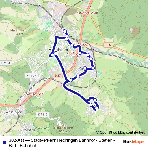 Click here to view the nearest 302-Ast - Stadtverkehr Hechingen Bahnhof - Stetten - Boll - Bahnhof bus stop.