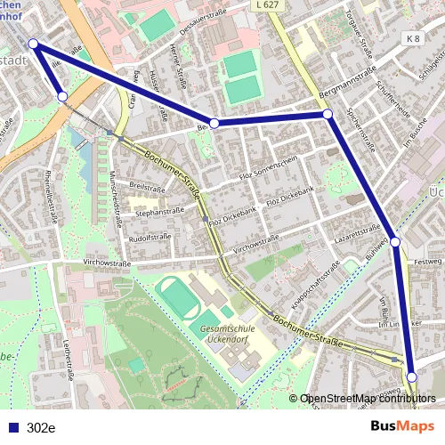 The first stop of the 302e bus route is GE Ückendorfer Platz and the last stop is
