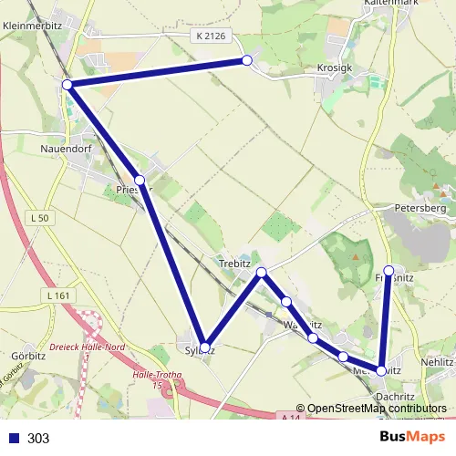The first stop of the 303 bus route is Krosigk, Neue Häuser and the last stop is Frößnitz (Petersberg), Köthener Str.. 303 is operational during täglich.