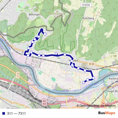 Gewerbestraße - Am Wasserkraftwerk - Niederholzstraße - Kraftwerkstraße - Bahnhofstraße - Gartenstraße - Lörracher Straße - Jaspersstraße - Markgrafenstraße - Scheffelstraße - Hebelstraße - Talstraße - Bettinger Straße