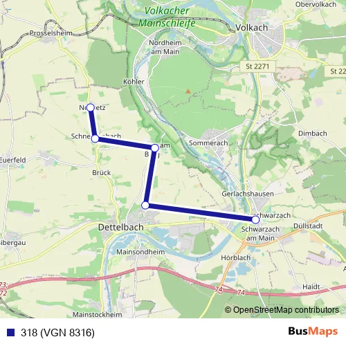 The first stop of the 318 (VGN 8316) bus route is Münsterschwarzach Abtei and the last stop is Neusetz Köhlerer Weg. 318 (VGN 8316) (318 (VGN 8316)) is operational during an Werktagen.