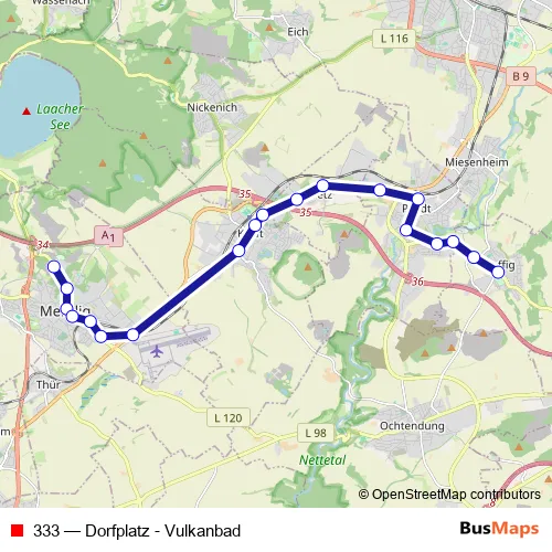 The first stop of the 333 bus route is Mendig Niedermendig Vulkanbad and the last stop is Saffig Dorfplatz. 333 (Dorfplatz - Vulkanbad) is operational during am Wochenende.