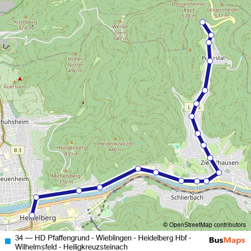 Bus 34 - HD Pfaffengrund - Wieblingen - Heidelberg Hbf - Wilhelmsfeld - Heiligkreuzsteinach in Heidelberg: Stops & Timetable